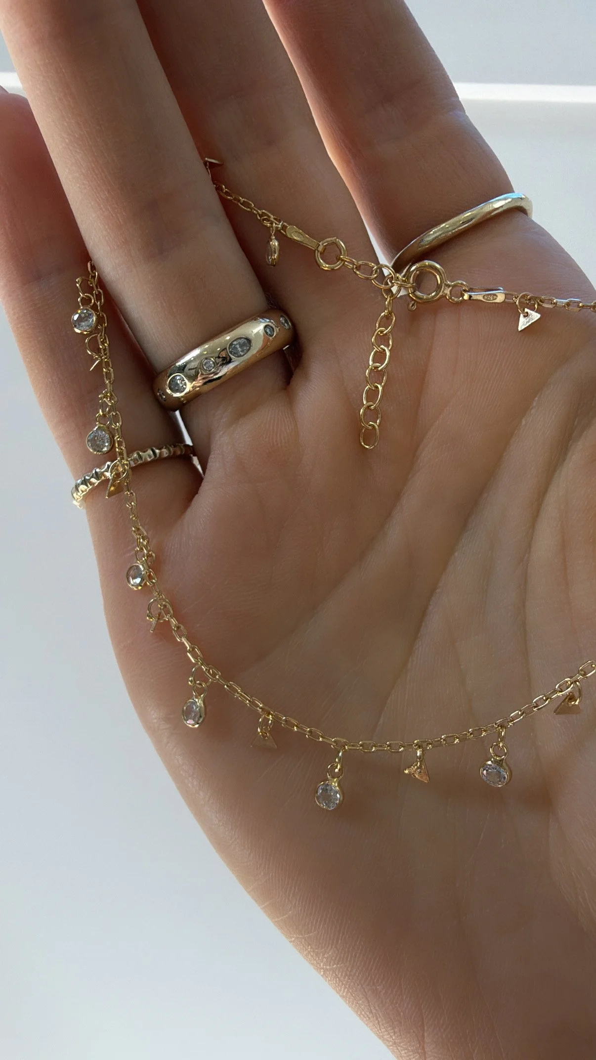 Made from sterling silver, with gold plating optional. Set with CZ stones. Measures 25cm + 3cm extension.